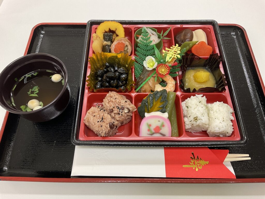 昼食に、おせち料理を提供させていただきました。