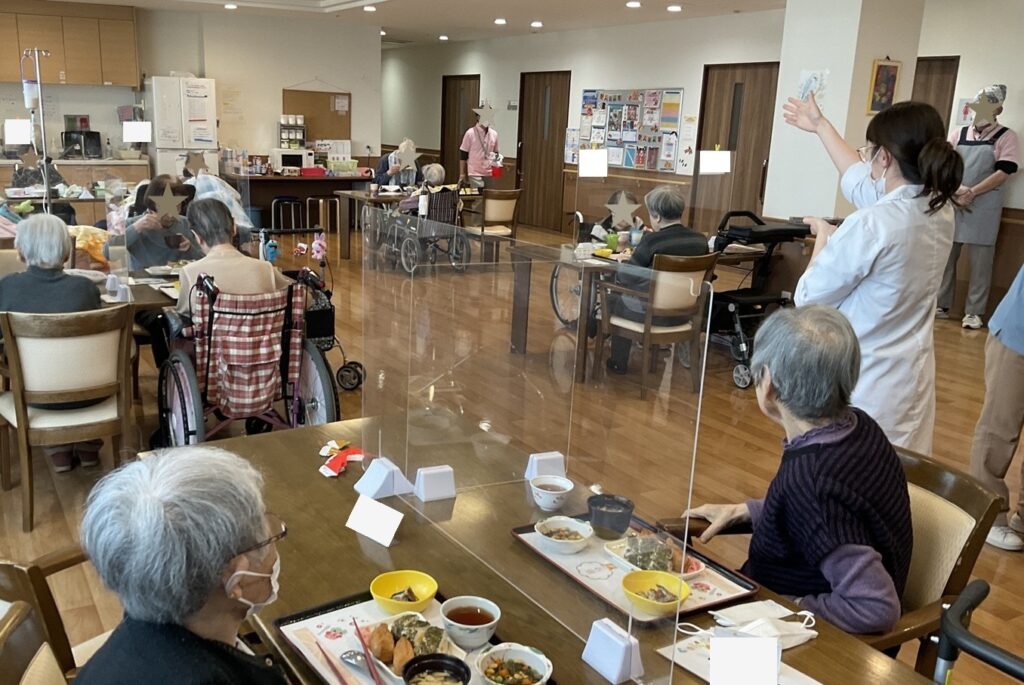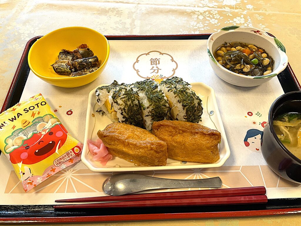 栄養士の方が来てくださり、各フロアをまわって献立の説明や今年の恵方が『南南東』であることなど節分のお話をしてくださいました。