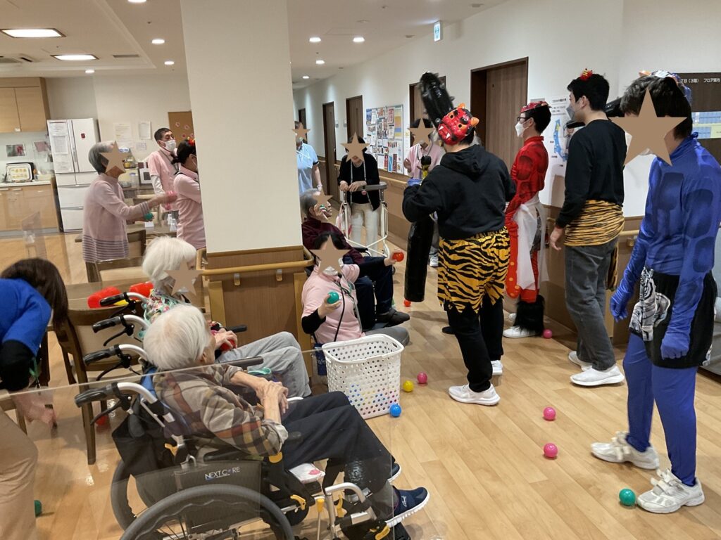 おやつの時間には、各フロアに鬼が現れて『鬼は外~福は内』の声と笑い声がフロアにひびき渡り豆の代わりにカラーボールで鬼退治です。