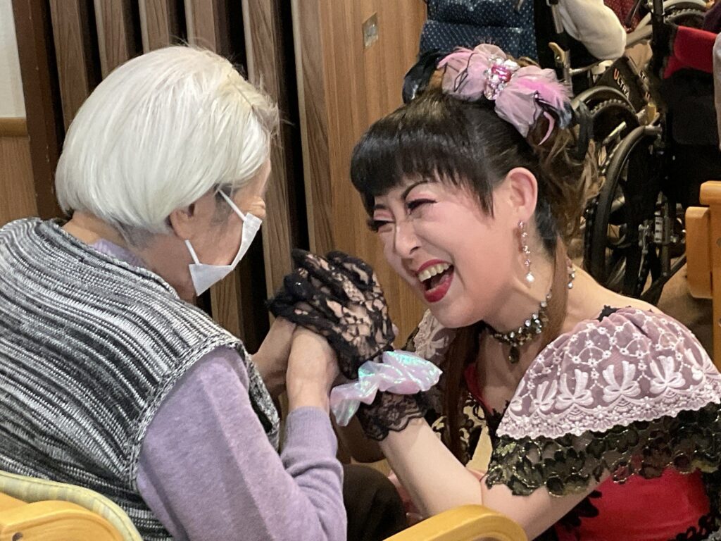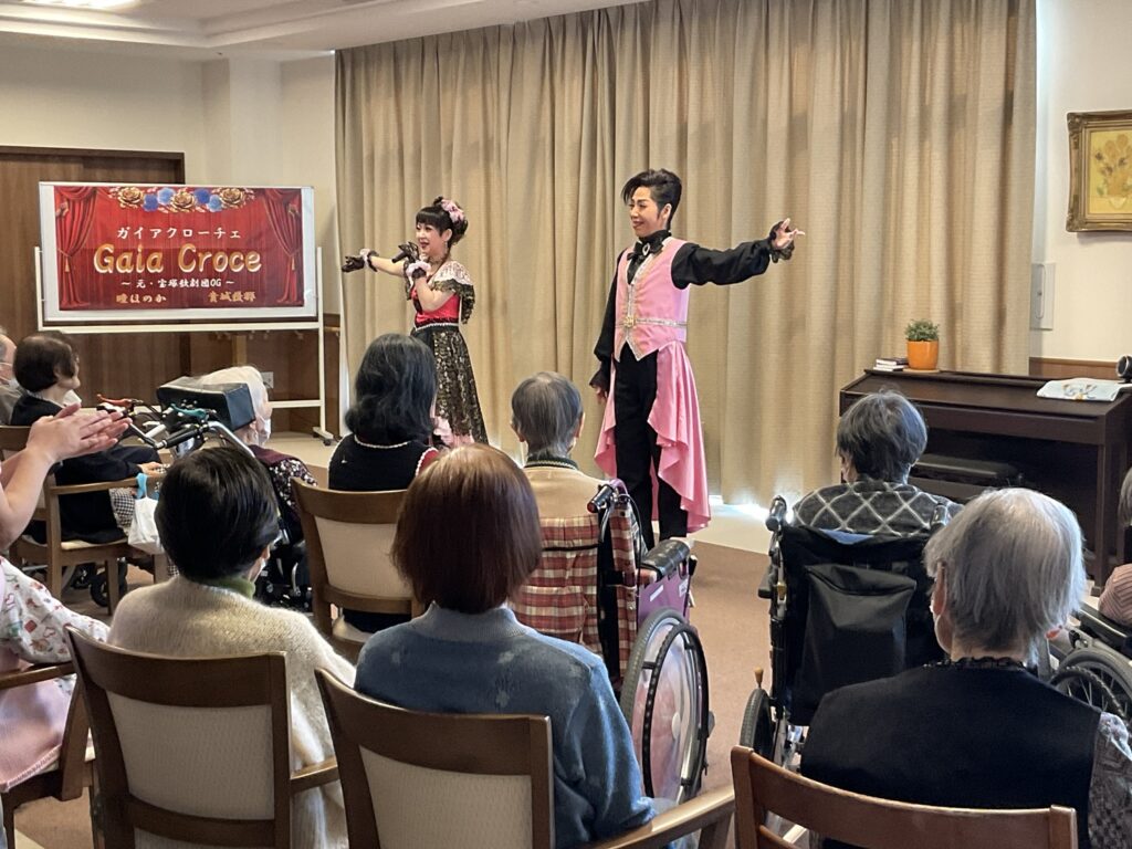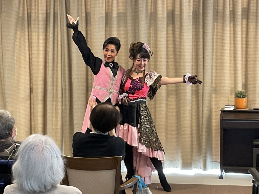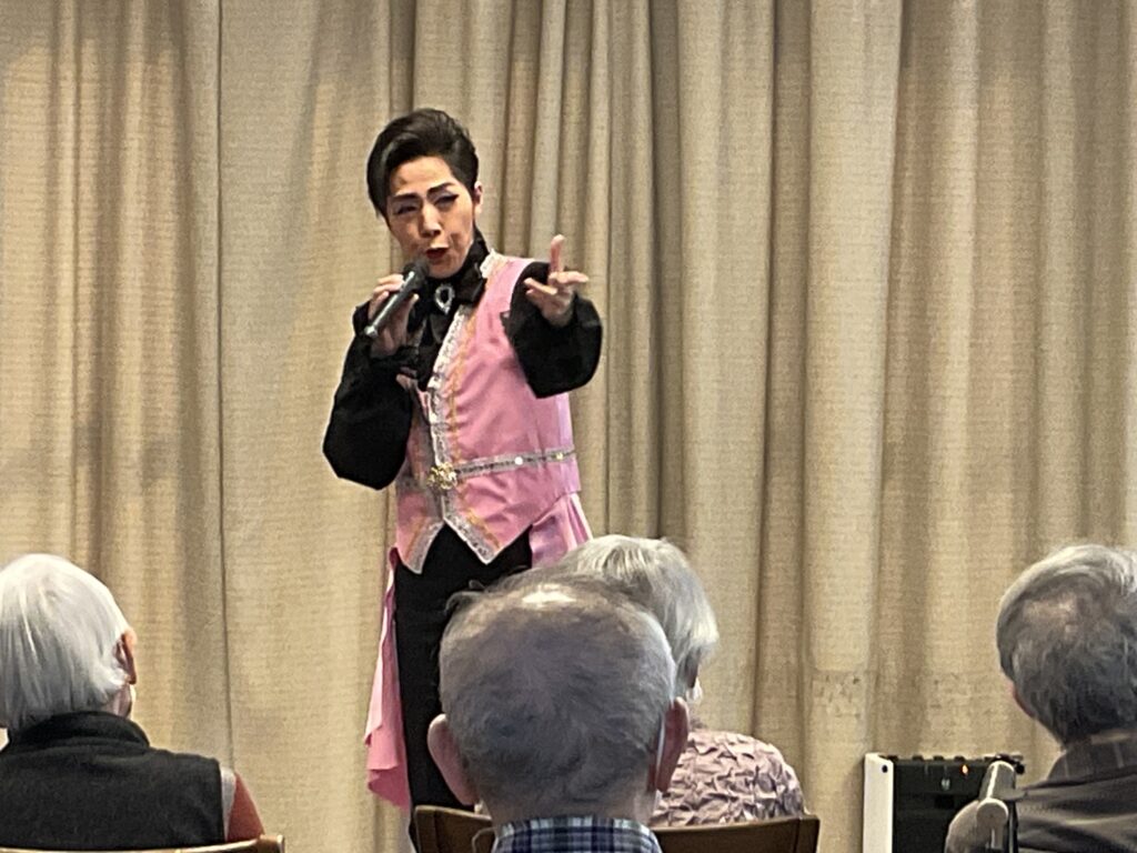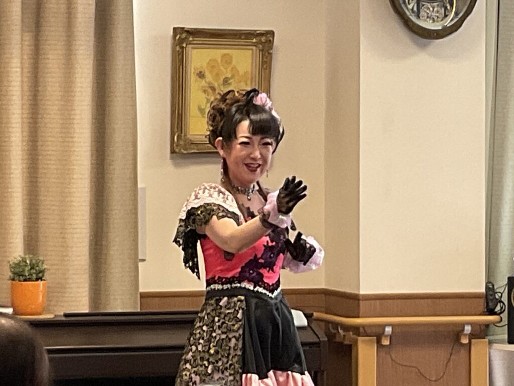 歌と踊りはもちろんですが、お話も楽しく客席を回って入居者様お一人お一人に声をかてくださり本当に楽しい時間を過ごさせていただきました。